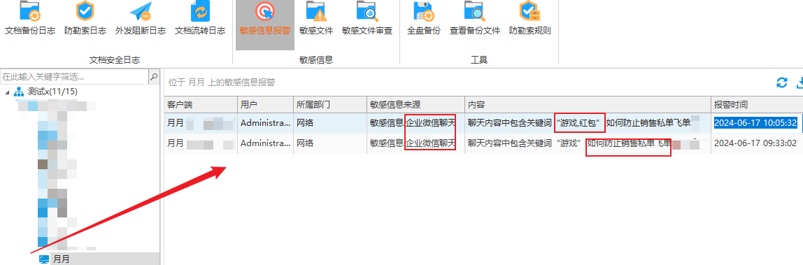 自定义设置敏感词,如果有人触发,在软件管理端会弹出弹窗,可以及时发现,以防数据泄露。
