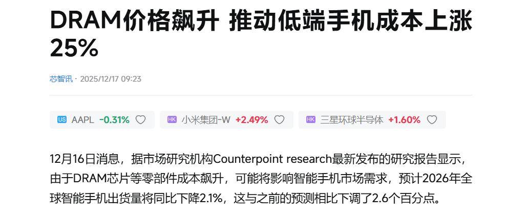 要知道,手机是一个高度依赖全球供应链的产业,一颗小小的芯片、一块屏幕、一组内存,背后都是技术和资本的密集投入。根据市场分析,由于内存等关键零组件价格上涨,预计到2026年,一台手机的物料清单成本将会飙升25%。