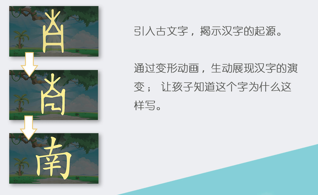 ——小学语文老师普遍推荐的科学识字方法,将每个汉字还原成甲骨文原始形态,通过生动动画展示从甲骨文到楷书的演变过程。比如“日”是圆圆的太阳,“水”是流动的小河,“山”是连绵的山峰,宝宝像看图画、听故事一样,就能理解汉字的“前世今生”,知道“这个字为什么这么写”,彻底告别枯燥的机械跟读。